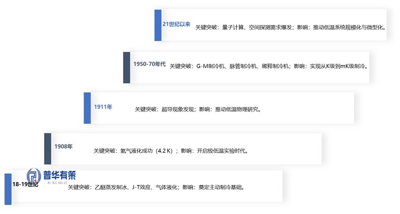 低温技术:量子计算、深空探测与清洁能源的“冷基石” 低温技术,泛指温度低于120 K(约-153°C)的技术体系,自工业革命以来,随着氮、氢、氦等气体的成功液化与超导现象的发现,迅速发展成为支撑前沿科技与工业应用的关键基础。普华有策报告系统回顾低温技术的发展历程,解析其核心原理与典型设备,并深入探讨其在科学研究、工业制造、航空航天与能源运输等领域的广泛应用,最后展望其未来向微型化、绿色低碳与智能化方向的发展趋势。 1、发展历程:从天然冰到量子冷却 人类对低温的利用可追溯至古埃及与商代,但真