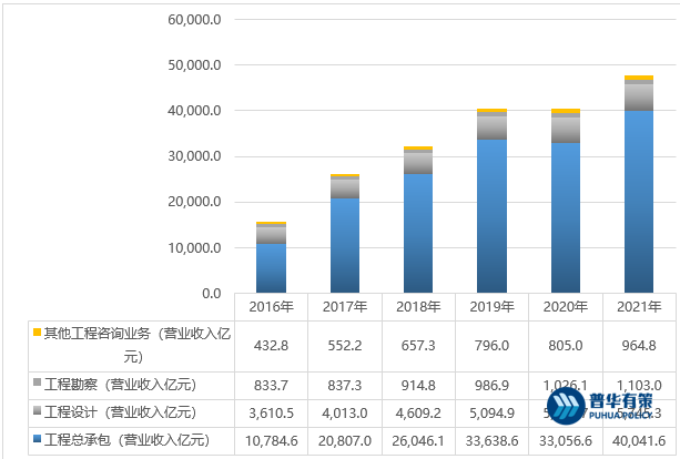 2021年全行业营业收入达到了8.40万亿元的规模。从营收年增长率来看,营收增速虽然总体呈下降趋势,但2021年营收增长率在2020年的基础上有所回升,达到了15.89%。从净利润来看,2021年全行业净利润达到了2,477.5亿元,净利润约与上年相比减少约1.4%。从各下属细分行业来看,根据住建部对行业内企业的统计数据,近年来,工程总承包、工程设计、工程勘察、其他工程咨询业务的营业收入均稳步增长。从2021年各下属细分行业的收入构成