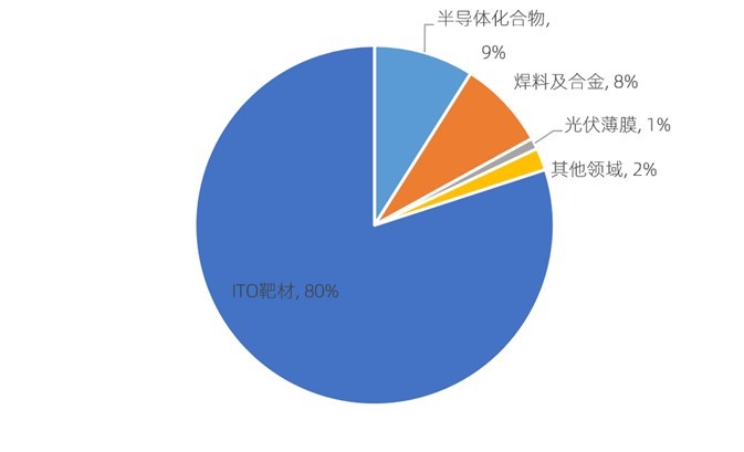 铟属于稀散金属,因其具有可塑性、延展性、光渗透性和导电性等特点,而以化合物、合金的形式被广泛应用。目前,铟的主要应用领域是平板显示领域,包括ITO靶材及新兴的铟镓锌氧化物(IGZO)靶材,占全球铟消费量的80%;其次是半导体领域、焊料和合金领域、太阳能发电领域等。生产ITO靶材对于铟的纯度要求一般在4N5及以上,生产化合物半导体材料对于铟的纯度要求则更高,一般在6N及以上。