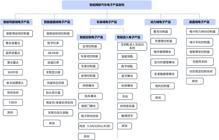 汽车电子于上世纪七十年代引入汽车工业,首次应用在发动机燃油喷射控制系统,极大改善了燃油效率。此后伴随着电子信息技术持续发展,汽车电子技术不断革新,汽车电子产品种类逐渐丰富。以智能网联汽车电子产品架构为例,根据功能与性质差异,汽车电子产品可以分为车身域电子产品、动力域电子产