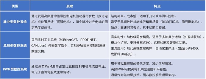 基于通信和控制方式角度,数控系统可以分为脉冲型数控系统、总线型数控系统以及PWM型数控系统,具体分类及特点如下: