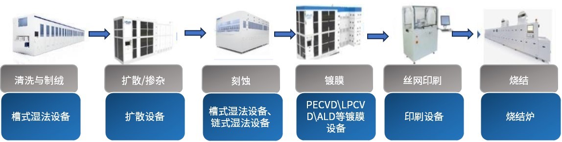 光伏湿法设备主要应用于光伏产业链中游的光伏电池片制造环节。如下图所示,光伏电池片生产流程主要包括清洗与制绒、扩散/掺杂、刻蚀、镀膜、丝网印刷和烧结等主要工艺。湿法设备主要应用于清洗与制绒、刻蚀核心工艺环节,设备技术水平直接影响光伏电池片的光电转换效率及性能。