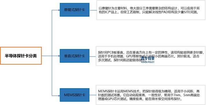 半导体探针卡是半导体晶圆测试中不可或缺的关键硬件,它作为测试机与待测晶圆的接触媒介,通过探针与晶圆上的焊垫或凸块接触,将电性信号传送到测试机台,从而分析晶粒的功能与特性,筛选出不良品,有效降低IC生产成本浪费。根据结构类型,半导体探针卡主要分为悬臂式探针卡、垂直式探针卡和MEMS探针卡。悬臂式探针卡成本较低,适用于传统模拟芯片、逻辑芯片等;垂直式探针卡针痕较浅,适合高端芯片的反复多次测试;MEMS探针卡则凭借其高度自动化和