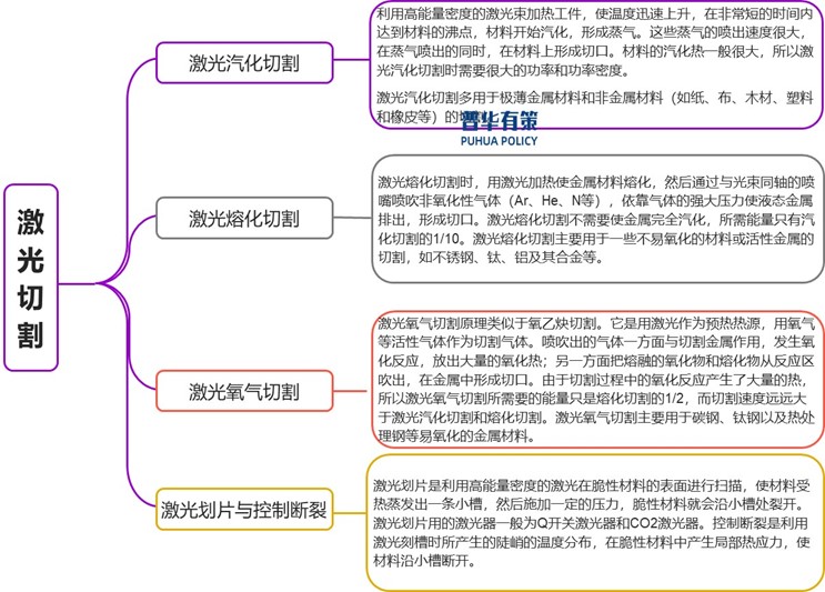 激光切割利用激光束高功率密度的特性,将激光汇聚到很小的光点上,快速加热材料使其达到沸点后汽化形成空洞,通过移动激光光束造成切缝,完成对物体的切割。激光切割属于热切割方法之一。按照工作原理,激光切割行业分为激光汽化切割、激光熔化切割、激光氧气切割、激光划片与激光控制断裂。