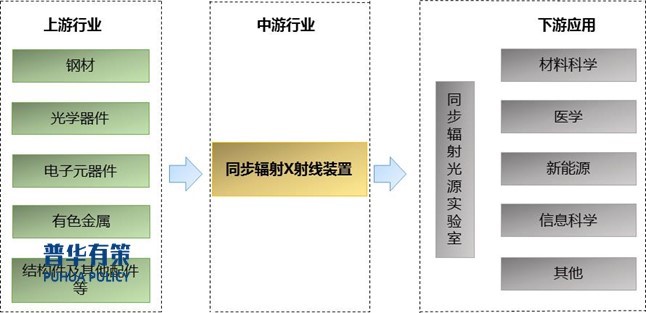 同步辐射X射线装置包括加速器、电子枪、调制器、加速管、输运线、注入、磁铁、束测、准直、电源、光束线及实验站等系统,上游行业为电子元器件、光学器件、钢材、有色金属、结构件等。下游为同步辐射光源实验室,主要用于材料科学、医学、新能源等众多领域的科研活动。