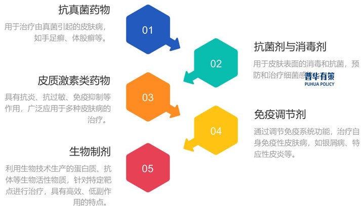 皮肤病药物行业专注于治疗各种皮肤疾病的药物及其配套产品的开发、生产和销售。该行业的产品种类丰富,涵盖外用药物的多种剂型,如洗剂、霜剂、软膏、溶液、泡沫剂、油膏、凝胶和胶贴等,主要用于治疗皮炎、荨麻疹、特应性皮炎等常见皮肤病。根据药物类别,皮肤病药物可分为抗感染药、皮质类固醇、抗痤