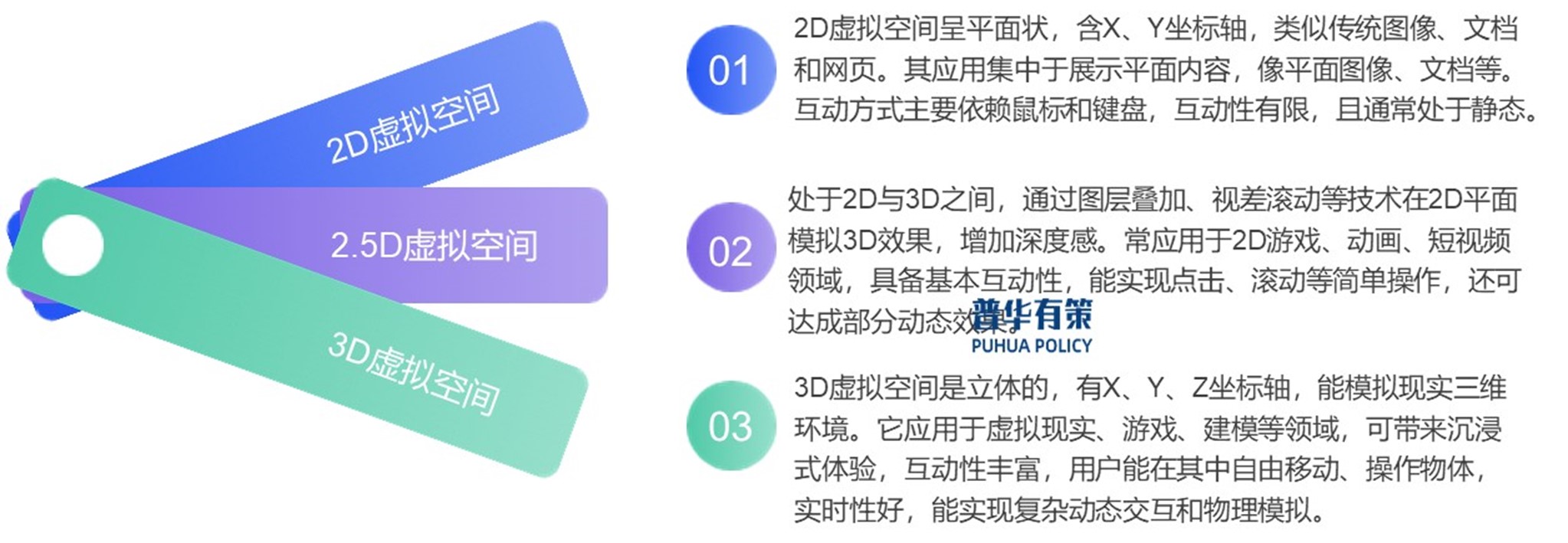 虚拟空间是运用虚拟现实技术、计算机图形和模拟等技术手段打造的不存在于物理世界的数字环境。用户能借助屏幕或其他交互界面与虚拟环境元素互动。其中,3D虚拟空间作为主流发展方向,依托XR实验室的高精度三维重建算法、实时定位技术和空间计算能力等AI技术,为空间数字化运营提供基础模型和数据。按空间维度,虚拟空间可分为2D、2.5D和3D虚拟空间,现阶段正处于2D向3D过渡的2.5D阶段。