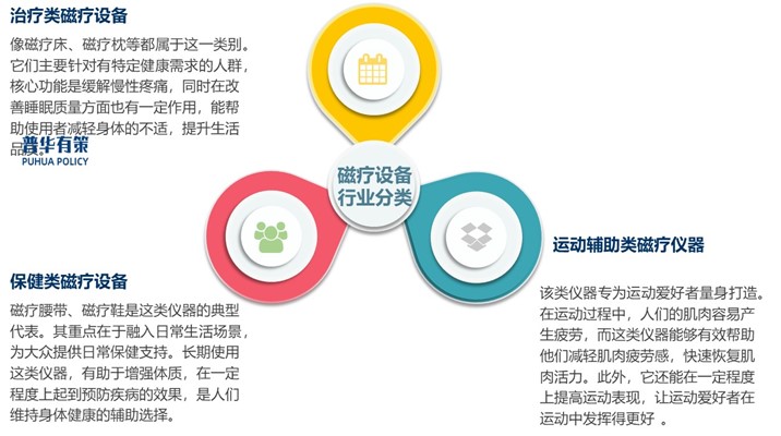 在磁疗设备行业中,产品种类繁多,按照其应用领域和功能的不同,磁疗设备可细分为治疗类、保健类和运动辅助类这三大类别。