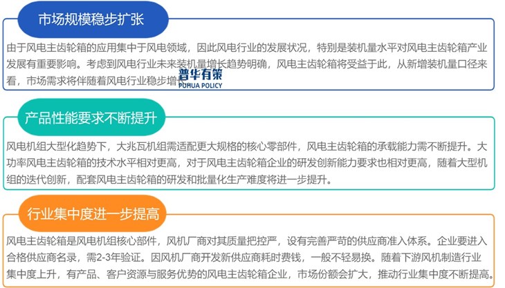 风力发电主要包括风电机组、风电支撑基础以及输电控制系统三大部分,其中风电机组主要由主齿轮箱、发电机、叶片、轴承等部件组成。风电主齿轮箱是连接风轮(叶片)和发电机的关键部件,其主要作用是将风轮在风力作用下所产生的动力传递给发电机并匹配发电机需要的转速。
