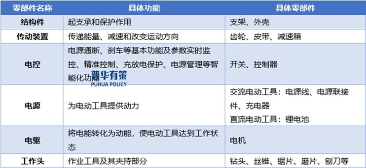 电动工具一般由电气与机械两大主要部分构成。其中,电气部分涵盖电控系统、电源装置以及电驱动装置等组件,负责为工具提供动力与控制信号;机械部分则包含结构件、传动装置和工作头,主要承担力的传递、转换以及执行具体工作任务等功能。相关零部件的具体功能如下: