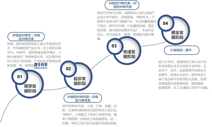 电动工具起源于欧洲。1895年德国Fein公司造出首台直流电钻。1946年美国用热固性酚醛塑料外壳提升电钻安全性。20世纪60年代初电子调速电动工具出现。此前电动工具靠交流电源,受电源线限制,特殊场景难用。1961年美国百得公司推出电池供电的永磁直流电钻,起初因功率、电池、材料成本问题发展慢,80-90年代才提速。我国电动工具产业在20世纪90年代承接国际分工实现飞跃,如今已是全球主要生产和出口国。