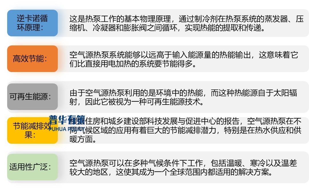 空气热能是指贮存在大气中的热能,空气热能来源于太阳能,是一种可再生能源的形式。空气源热泵是利用逆卡诺循环原理,用少量能源驱动热泵机组,通过热泵系统中的工作介质进行变相循环,把空气中的低温热量吸收压缩升温后加以利用的一种高效集热并转移热量的节能技术。以下是空气源热泵的一些关键点: