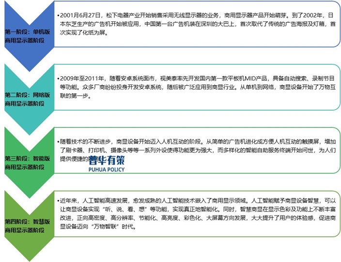 商用显示简称商显,因其同时具备显示和拥有智能交互功能而广泛运用于商场广告、学校多媒体教室展示、地铁以及公交车内显示等应用场景,又称智能交互显示设备。商显行业发展至今已有近二十年的发展历史,从最初的简单广告机到现在的泛智能化的大屏商显,总共经历了四个阶段: