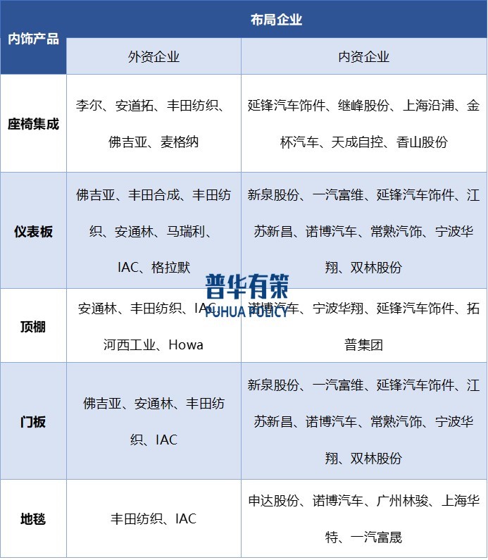 国内汽车饰市场也呈现低集中度特点,竞争格局较为分散,分为外资供应商、主机厂下属供应商、独立第三方供应商。目前我国汽车内饰行业中,主要品牌包括三类:外资零部件企业(如佛吉亚、安通林、丰田合成等),主机厂下属零部