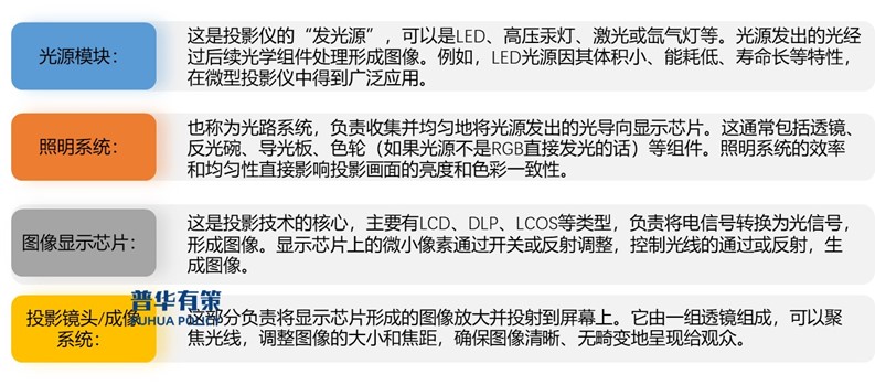 投影设备是一种将图像或视频数字信号通过显示芯片转换为光信号后,经过光学镜头投影到幕布上的智能设备。投影显示中光学引擎即光学系统是投影仪的核心部分,其工作状态直接影响着整机的性能。光学系统主要包含四个部分: