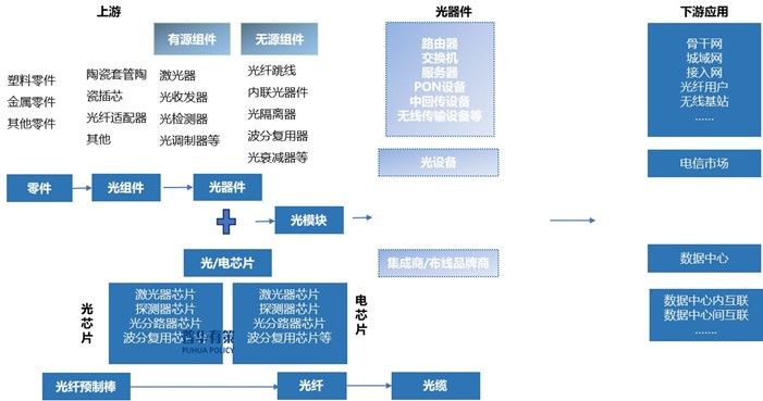 光通信网络由光/电芯片、光器件、光模块、光纤光缆等上游产品组合构建而成。其中