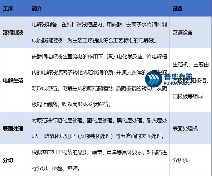 根据生产工艺的不同,可以分为电解铜箔、压延铜箔。压延铜箔是通过物理手段将铜原料反复辊压加工而成。电解铜箔是指以阴极铜或铜线为主要原料,采用电化学沉积法生产的金属箔材。将铜料经溶解制成硫酸铜溶液,然后在专用电解设备中,在直流电的作用下,使硫酸铜溶液中的铜离子在阴极还原成铜而制成原箔,再对其进行表面粗化、固化、耐热层、耐腐蚀层、防氧化层等表面处理,其中锂电铜箔主要进行表面有机防氧化处理,最后经分切、检测后制成成品。电解铜箔