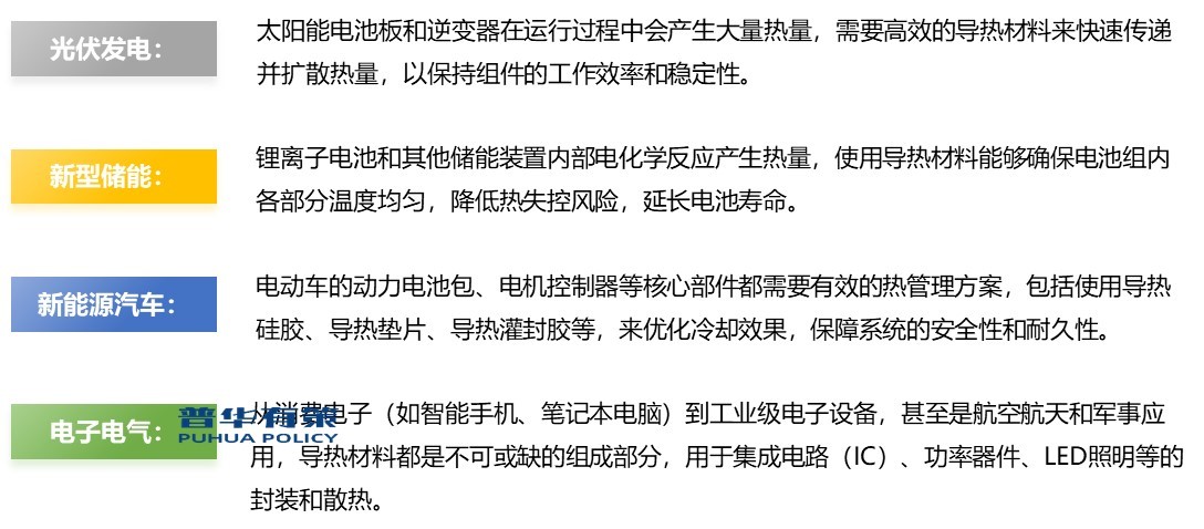 具体来说,在下游应用市场上,光伏发电、新型储能技术、新能源汽车和电子电气等行业对导热材料的需求尤为显著。具体分析如下: