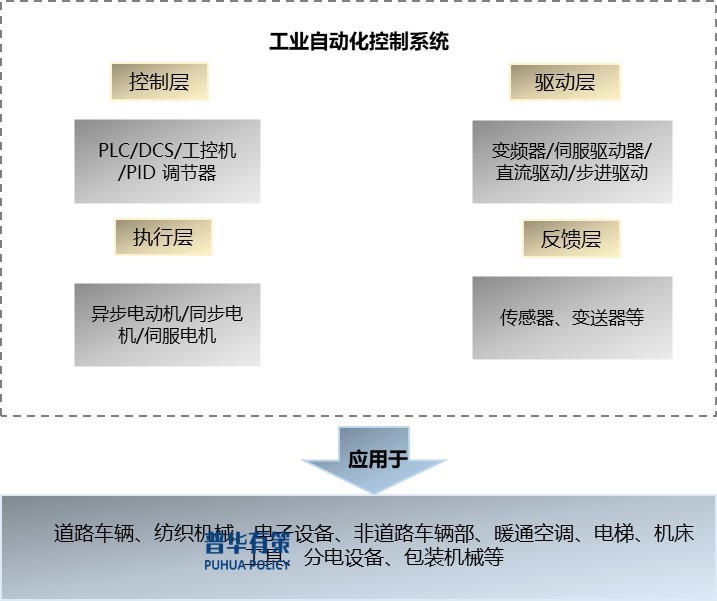 工业自动化控制是指在无人干预的情况下通过程序控制使得机器设备完成工作流程的技术,主要利用电子电气、机械、软件的组合,实现机器设备生产制造过程更加自动化、精确化、高效化,具备可控性。工业自动化控制系统作为智能装备的重要组成部分,是发展先进制造技术和实现生产自动化、数字化、网络化和智能化的关键,是实现产业结构优化升级的重要基础,广泛应用于生产与机械运动的各行各业。工业自动化控制产品从功能上