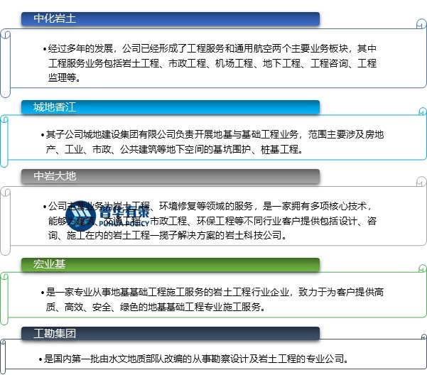 我国拥有岩土工程专业承包资质的企业众多,目前参与岩土工程行业市场竞争的企业主要分为两类,一类是中大型工程施工企业,此类企业具备较强的技术实力和项目经验、拥有较好的施工资质和管理水平、拥有良好的品牌优势及客户关系,有实力竞争国家重点及其他大中型岩土工程项目;另一类是小型岩土工程施工企业,该类企业数量众多、规模偏小、技术水平较低,一般只能提供单一的施工服务,差异化不足,价格竞争较为激烈。