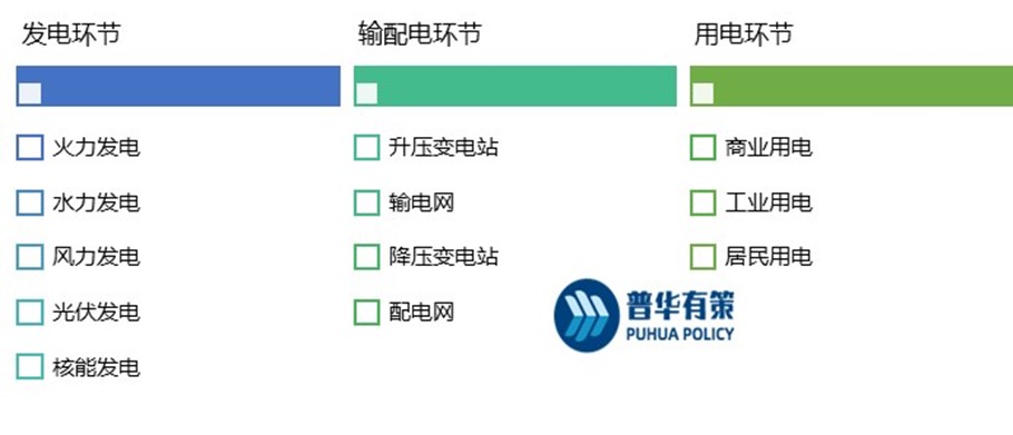 电力系统主要分为发电、输配电和用电三大环节。发电环节是指发电企业利用发电动力装置将其他类型能源转化为电能的过程,又被称为电源环节;输配电环节将发电企业生产的电能按照合理的电压等级升压输送并分级降压到用户使用,输配电环节包含输电、变电和配电,输电是指电力的运输,变电指电力运输过程中为减少能耗进行的升压或配电、用电前的降压过程,配电指电力系统向终端用户分配电能的环节,输配电过程又被称为电力系统中的电网环节