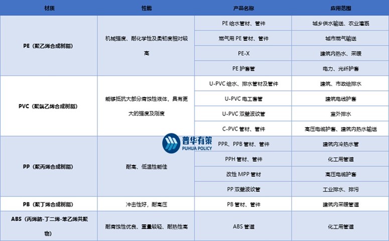 塑料管道产品品种多样,原材料主要为石油化工产品,按原料材质可分为PE管、PVC管、PP管、PB管、ABS管等。
