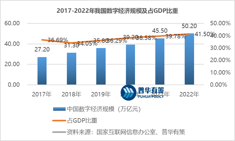 数字化转型是指深化应用新一代信息技术,激发数据要素创新驱动潜能,建设提升数字时代生存和发展的新型能力,提高数字化、网络化、智能化水平,实现转型升级和创新发展。我国数字经济保持较快发展,总量连续多年位居世界第二,数字经济规模由2017年的27.20万亿元增长到2022年的50.20万亿元,年复合增长率为13.04%。数字经济占GDP的比重也逐年增长,占比由2016年的32.69%增长至2022年的41.50%,成为推动经济增